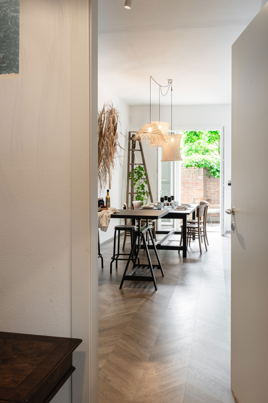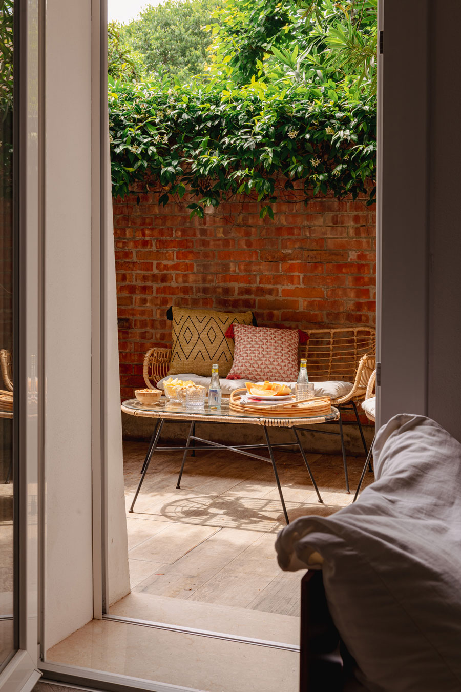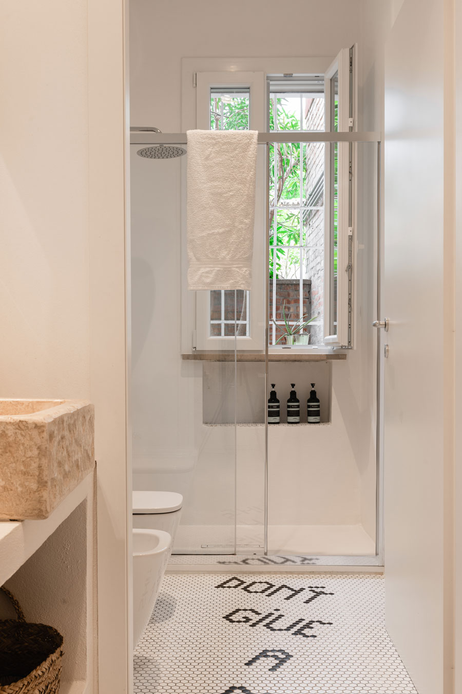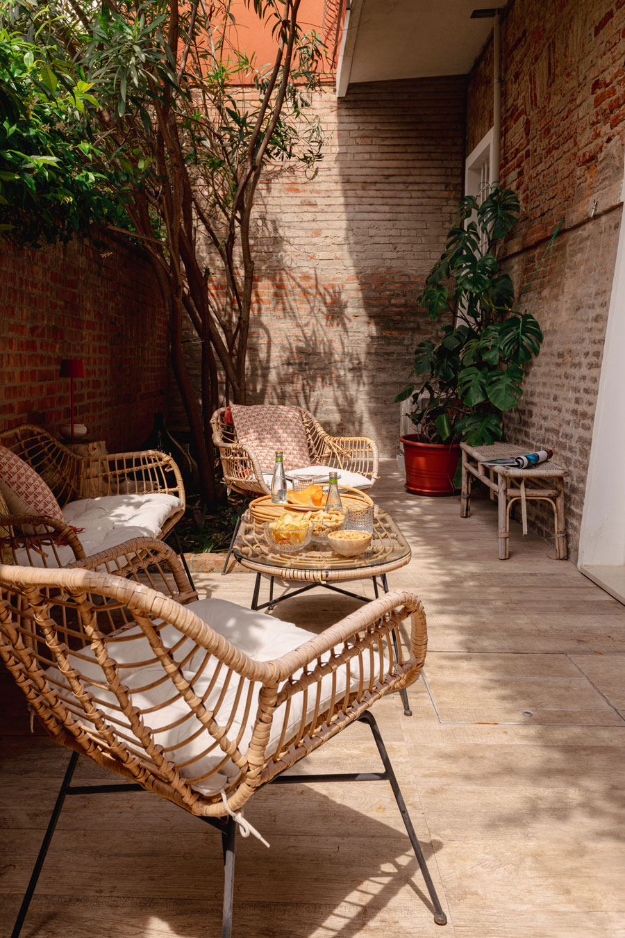 Attraverso un accesso indipendente, si accede alla prima stanza con cucina, dotata di piano cottura, forno, frigorifero, macchina da caffè Nespresso e bollitore. Il tavolo da pranzo, estensibile, è ideale anche per corsi di cucina o per lavorare. Il secondo ambiente dispone di divano, poltrona letto e guardaroba, con la zona notte nascosta dietro una parete, con letto matrimoniale o a due piazze. Il bagno è dotato di una comoda doccia con vista sul patio esterno. Entrambe le stanze si affacciano su un patio privato con cancello che si apre sul giardino interno.